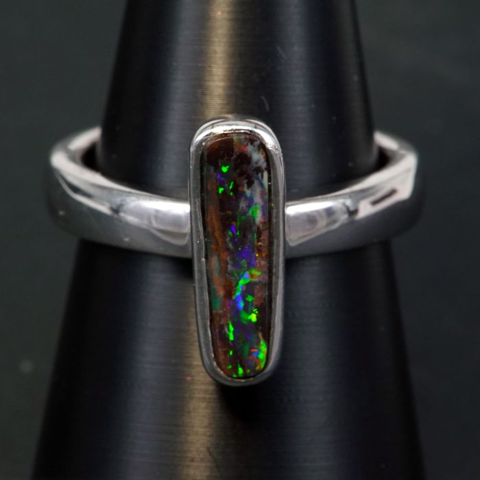 The sterling silver ring is mounted with a natural rectangle shaped Queensland boulder opal, measuring 13x4mm. The stone flashes with green ,orange, and blue colours. Whilst minor ironstone appears on the face of the gem, noting the natural organic nature of the gem, with every turn of the ring, the bright colours emerge.