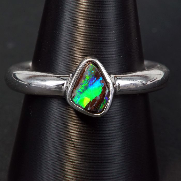 The sterling silver ring is mounted with a natural free-form Queensland boulder opal, measuring 8.0mm x 5.0mm. The stone flashes with green,orange, and blue colours, minor ironstone appears on the face of the opal, noting the natural organic nature of the gem. Upon each movement, the vibrant colours flash over the stone.The gem is bezel set, within a round band measuring 4mm in width. Feels smooth on the finger. so easy to wear !!