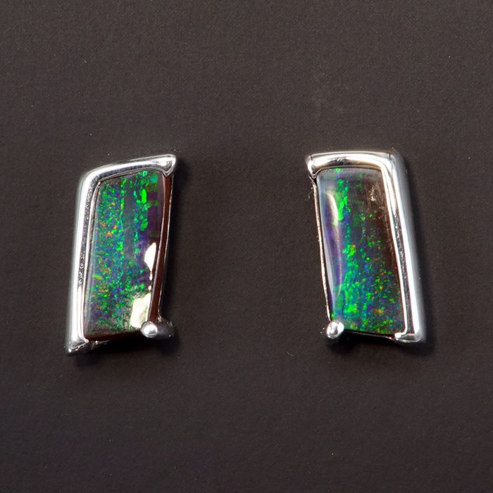 These simple earrings feature a rectangle shaped boulder opals, weighing 3.42cts. The opals are bezel end set in rhodium plated sterling silver. Colours of green and gold are displayed in the gems in a pinfire pattern.