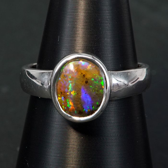 The sterling silver ring is mounted with a natural oval Queensland boulder opal, weighing 2.10cts total. The opal displays all the colours of the spectrum, whilst there is minor ironstone appearing on the face of the gem, with every turn of the ring the colours emerge in a blocky flash pattern.
