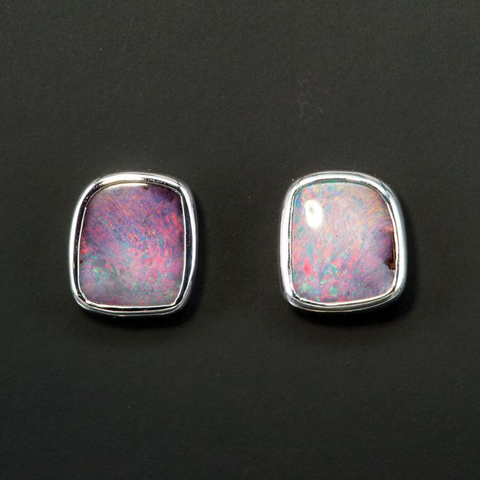 These simple bezel set stud earrings feature freeform boulder opals. The vibrant colours displayed show all the colour spectrum in a pinfire pattern.