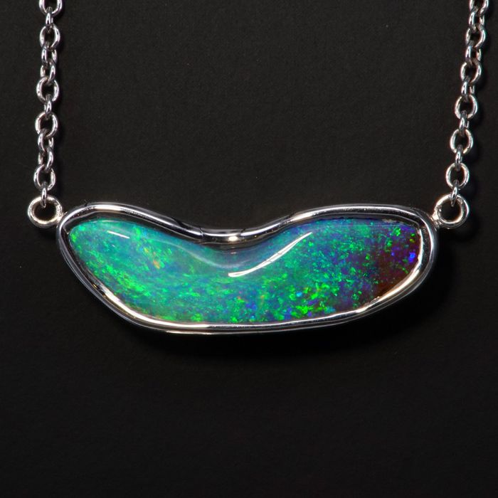 One STERLING SILVER RHODIUM PLATE NECKLACE set with a single Boulder Opal from Queensland, weighing 5.28cts total. This free-shaped gem is bezel set, following the shape of the free-form stone. The display of colours consist of green, gold and blue with a pin-fire pattern.