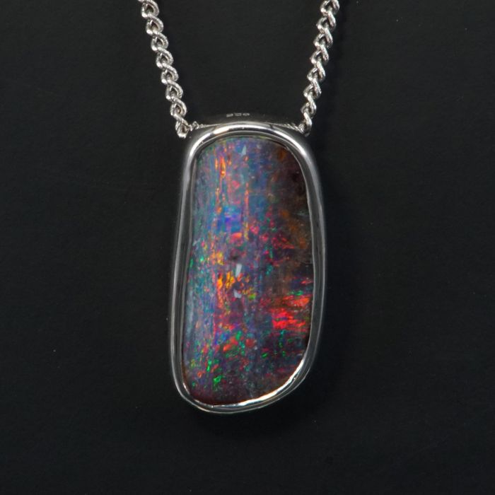 STERLING SILVER RHODIUM PLATE PENDANT set with a Boulder Opal from Queensland weighing 6.30cts. The free-shaped gem is set in a bezel setting, following the shape of the free-form stone. Whilst minor ironstone appears on the face of the gem, noting the natural organic nature of the opal, the display of colours consist of the full spectrum, in a blocky pattern.