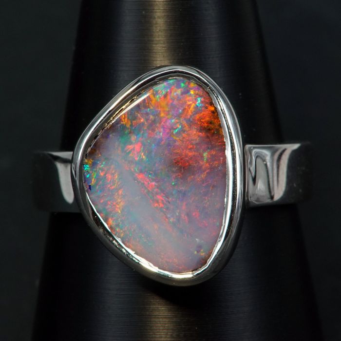 The ring is sterling silver rhodium-plated and the free form boulder opal is elegantly set in a bezel setting which follows the natural formation of the stone. The colours displayed in this gem are many; green, gold, blue, orange against a smokey blue undertone. At every angle the stone moves, a wonderful colour emanates in a swirling pattern.