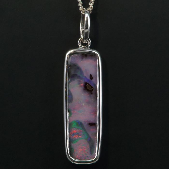 STERLING SILVER RHODIUM PLATE PENDANT set with a Boulder Opal from Queensland measuring 24x7mm. The rectangle-shaped gem is set in a bezel setting, following the shape of the stone. The display of colours consist of multi colours with a predominance of green, gold orange and pink hues , with a swirling pin-fire pattern.