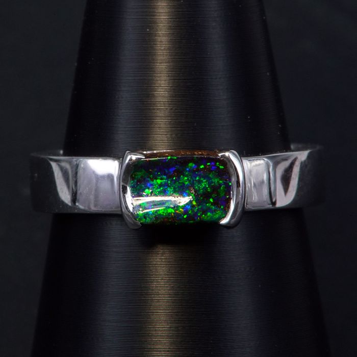 The semi bezel setting holds a rectangle shape opal with vibrant green, blue and gold hues emanating from the stone in a blocky pattern. The undulating form of the gem is indicative of wonderful boulder opal.