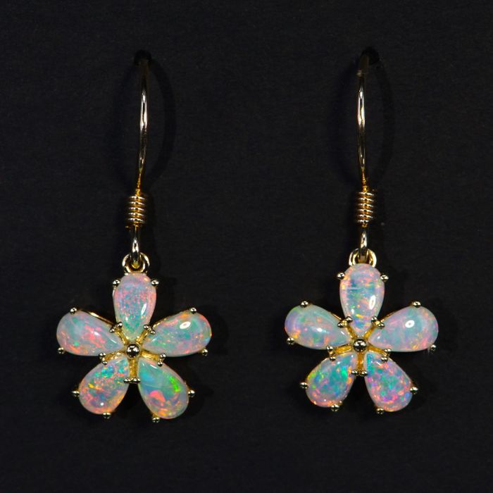 A beautifully designed pair of light opal earrings with shepherd's hook fittings, capturing the essence of spring and summer. Each earring is crafted from 14K yellow gold and claw-set with five natural Australian light opals
