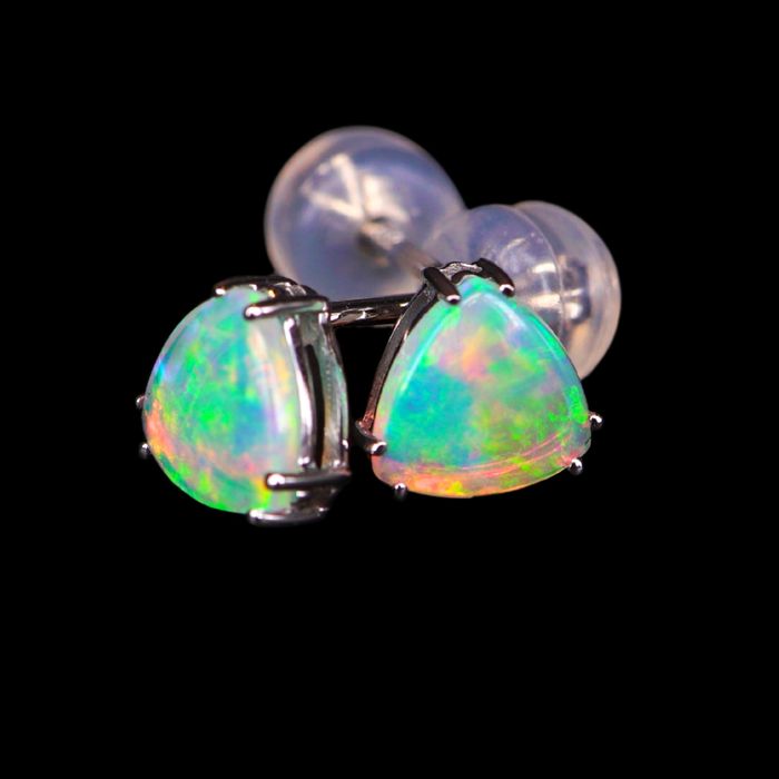 Delicate yet dazzling, these natural light opal studs showcase 0.83 carats of crystal opals in soft triangular shapes. Set in 14K white gold with a refined claw grip, the opals radiate vivid flashes of green, yellow, red, and blue.