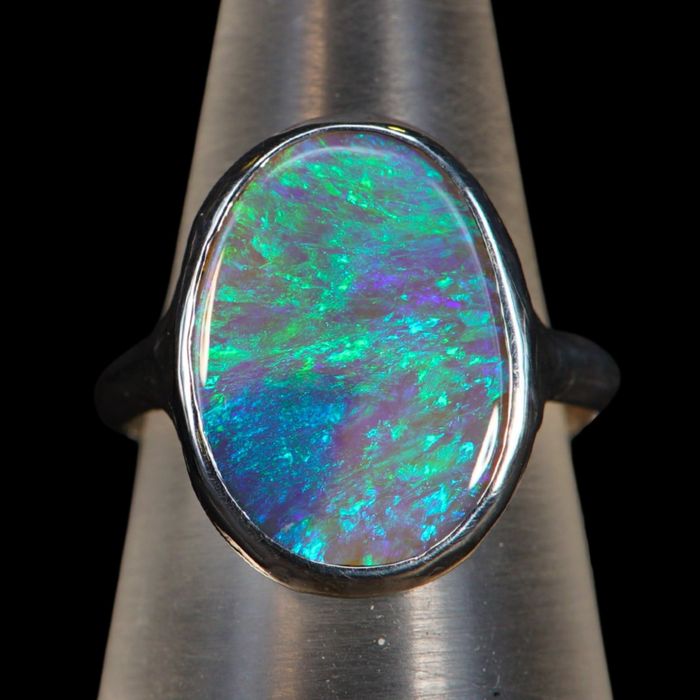This captivating sterling silver black opal ring features a 2.97ct freeform opal in mesmerizing blue and green hues, exuding natural allure. The opal is securely embraced by a sleek bezel setting, crafted from rhodium-plated sterling silver for lasting shine and durability.