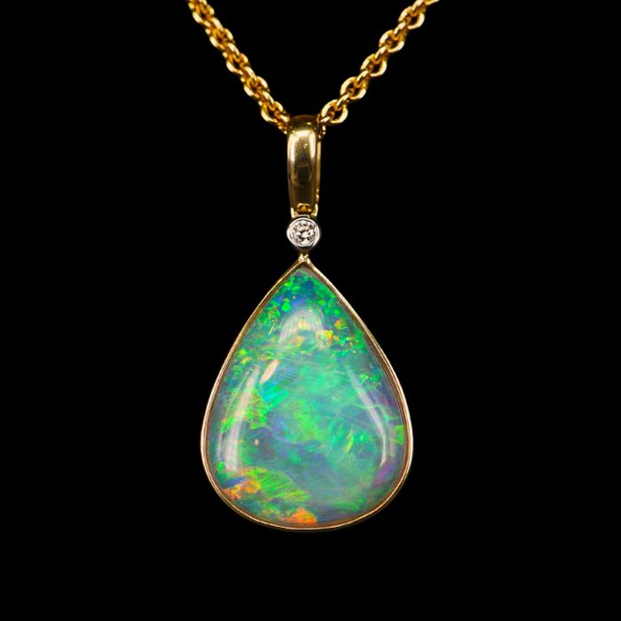 This light crystal opal pendant is set in 18k yellow gold. The 7.74ct teardrop-shaped opal is securely held in a smooth bezel setting, allowing its vivid flashes of blue, gold, orange, and green to stand out.