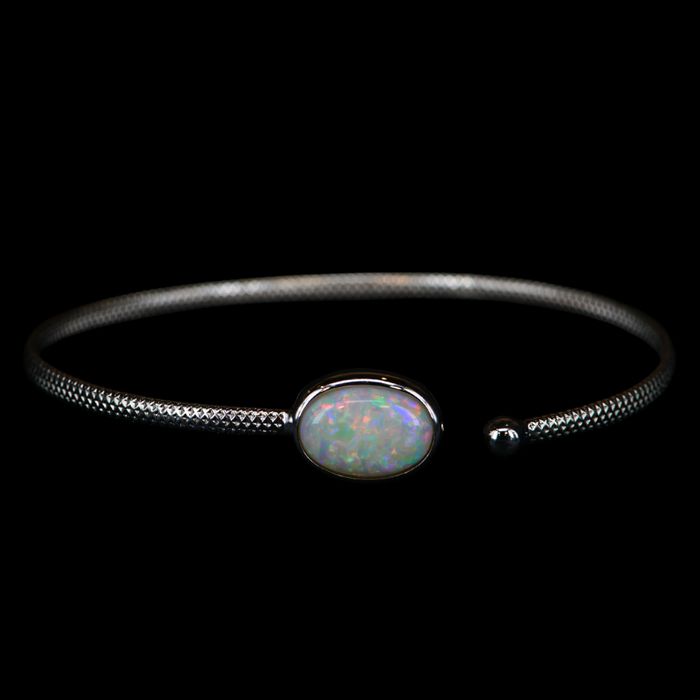 This light opal bangle showcases the oval-shaped opal’s beauty. Set in sterling silver, the large opal is securely held within a smooth bezel setting, allowing its subtle flashes of red, purple, and green to shimmer with movement.