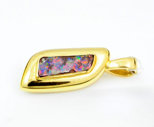 The 18K yellow gold pendant is mounted with a free form natural Queensland boulder opal. The opal weighs 1.55ct in total and displays red, blue and green colour formation.