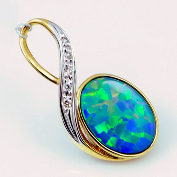The yellow gold pendant is set wtih an oval opal doublet, measuring 12mm x 9mm. The opal dispays blue, green and yellow colours. Accompanying the opal are five brilliant cut diamonds, weighing 0.02cts in total.
