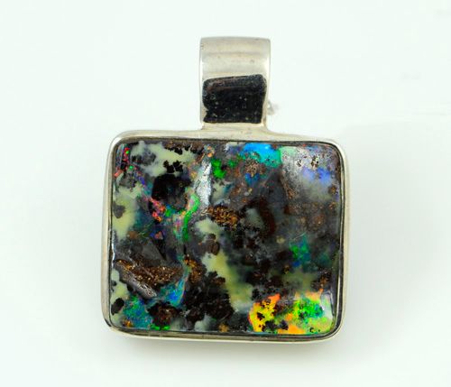 A beautifully dark natural boulder opal from central Queensland, displaying blue and green flash over a brown earthy background.