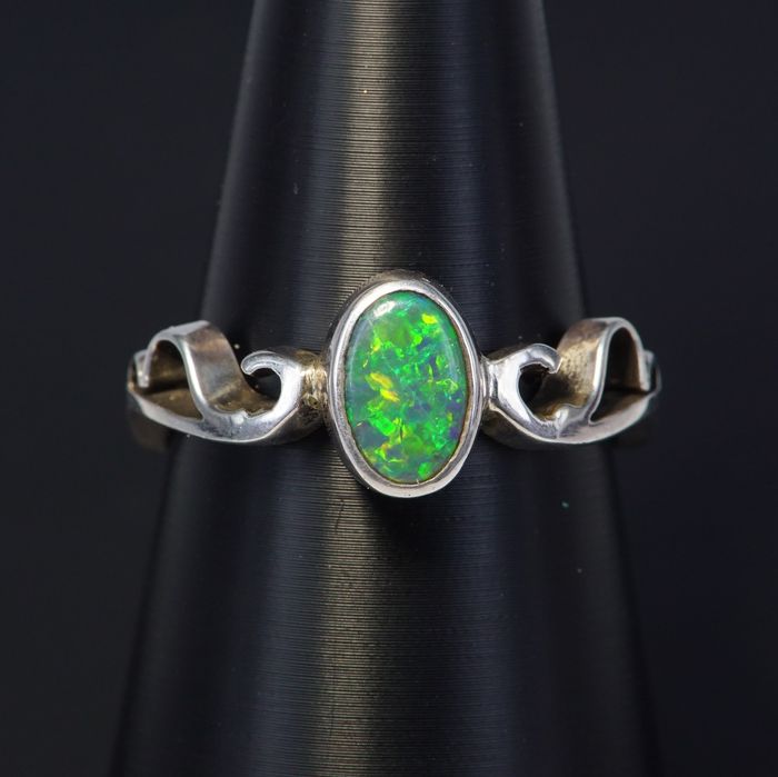 This natural, oval black opal emanates with vibrant blue and green colour. The opal, originating from Lightning Ridge in New South Wales, is set in a sterling silver, rhodium plated ring. The deisgn features detailed silver on either side of the bezel-set opal.
