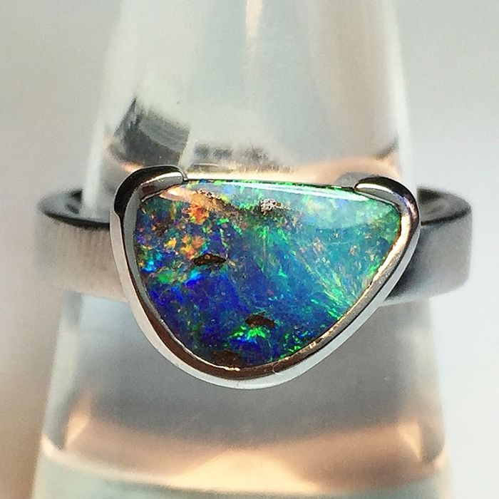 This free form boulder opal is encased within a half bezel sterling silver ring setting. The opal, originating from Queensland, flashes with brilliance as the green, gold and blue colours move across the face of the stone. Size O ( 7 )