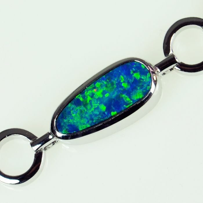 Free form doublet opal displaying blue, green and violet colour. Set in a sterling silver, rhodium plated bracelet.