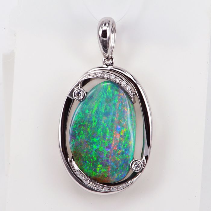 18K White Gold Pendant set with Solid Boulder Opal (weighing 13.11cts) from Queensland. The uniquely elegant setting holds the opal which is surrounded by 18 diamonds (weighing 0.108cts total) allowing all the glorious colours of the gem to shine through. Predominately green, gold, orange, blue and violet hues in a stripey floral pattern emanate from this gem.