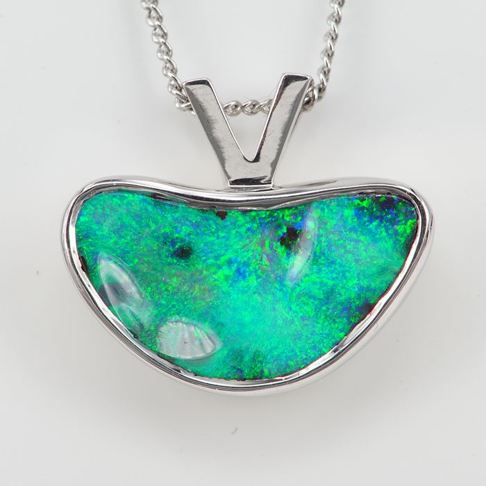 The free-form, indulating gem is set in a bezel setting following the natural curve of the opal, which displays colours of green, gold and blue in a pin-fire pattern. Slight ironstone appears on the face of the gem, highlighting the natural organic nature of the beautiful gem.